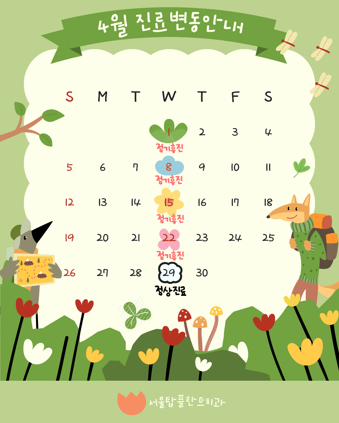 * 4월 29일(수) 정기휴진 -> 정상진료로 변경되었습니다.